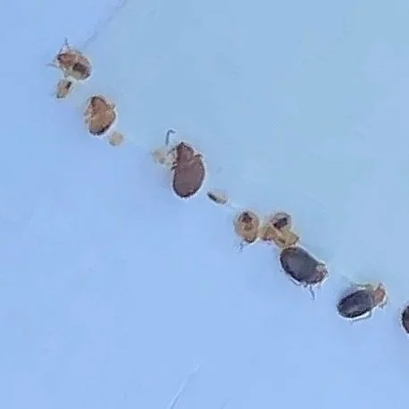 Shed skins or exoskeletons around bed frames, headboards, or baseboards.